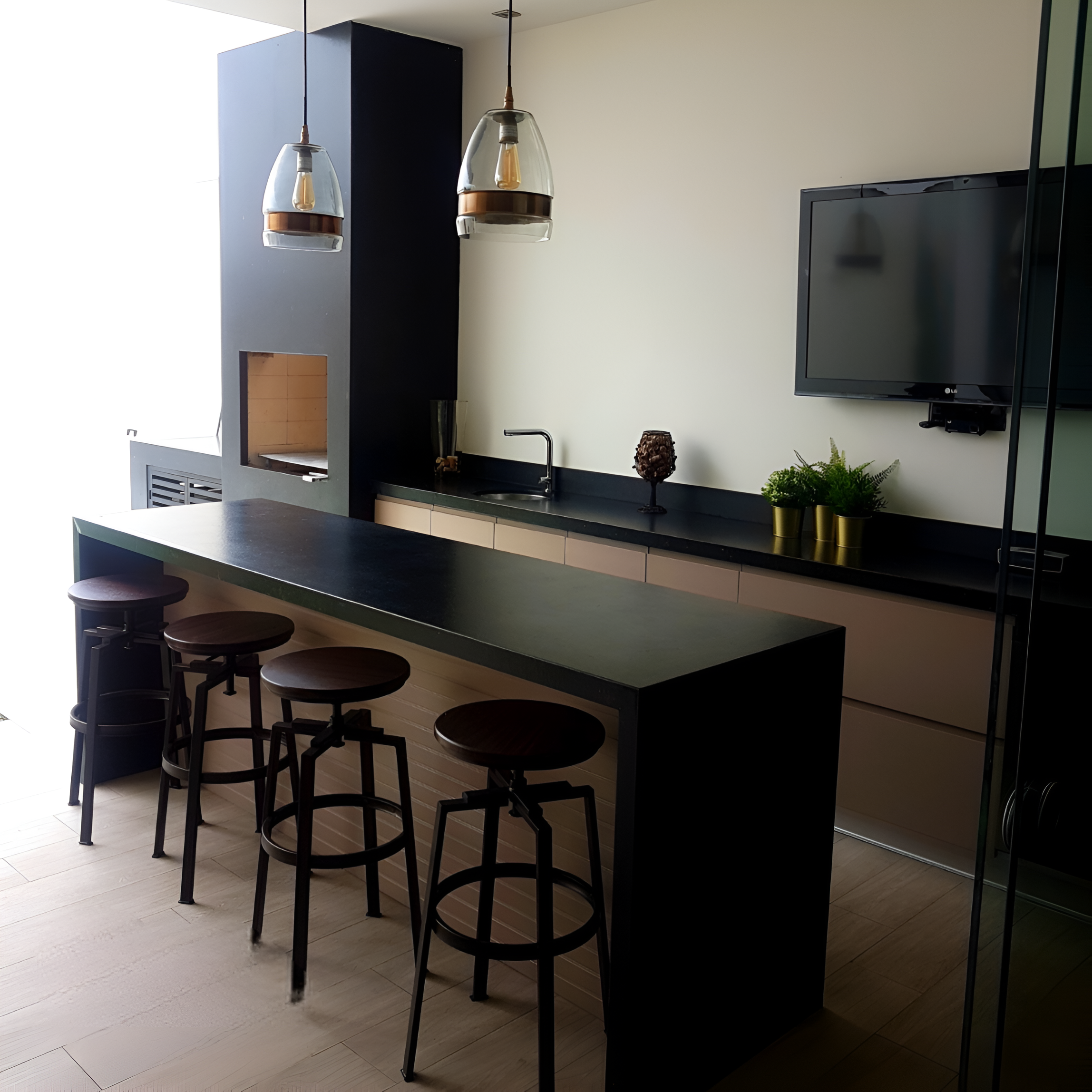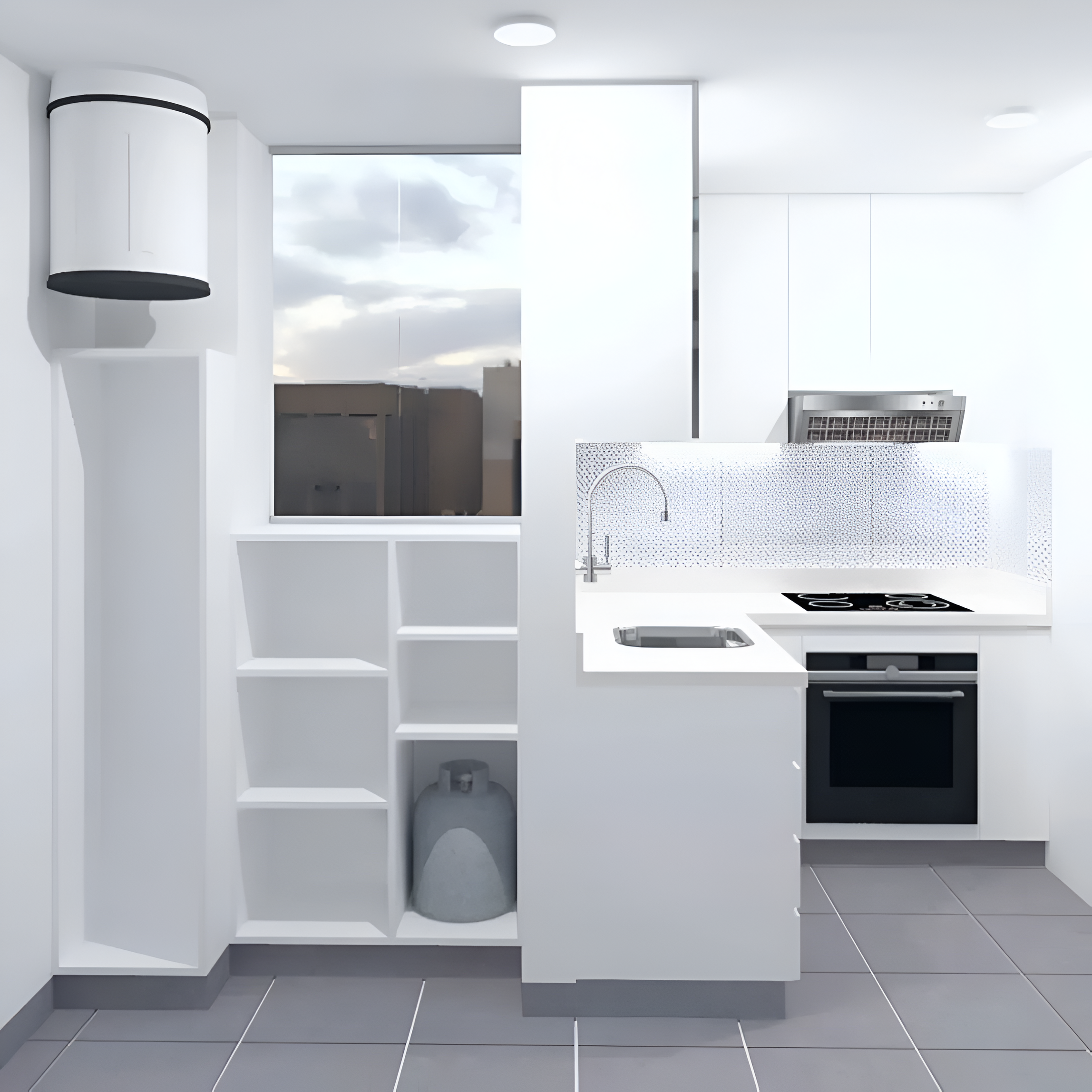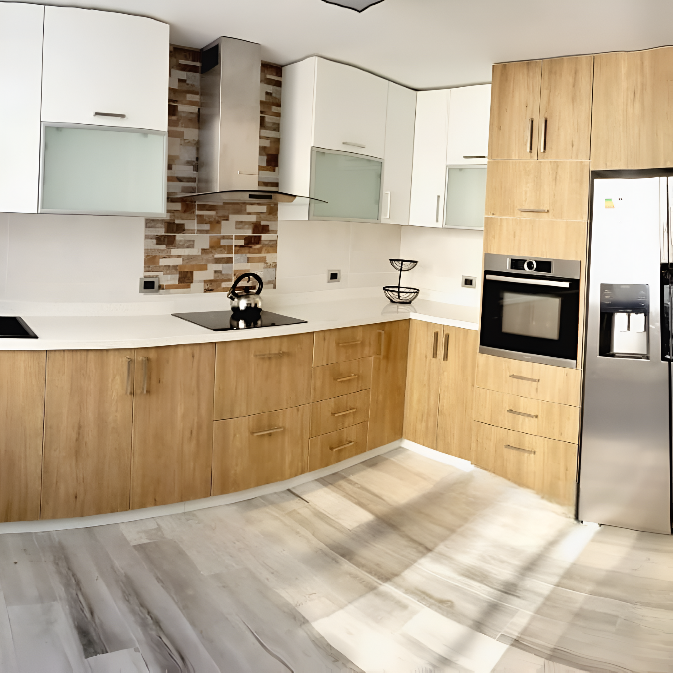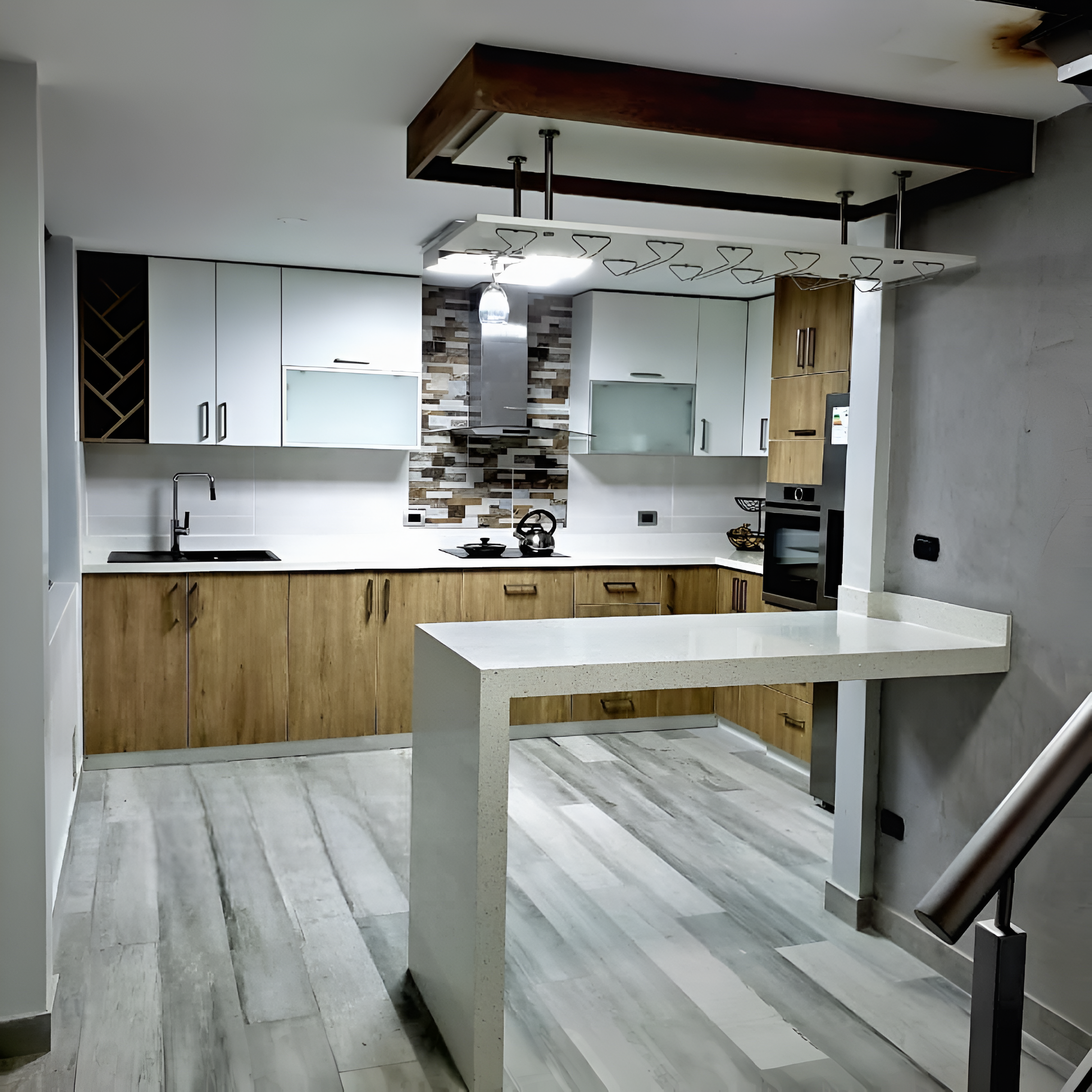 Cocina moderna y funcional que combina estilo y practicidad, destacada por sus encimeras de granito oscuro que ofrecen durabilidad y un acabado elegante.